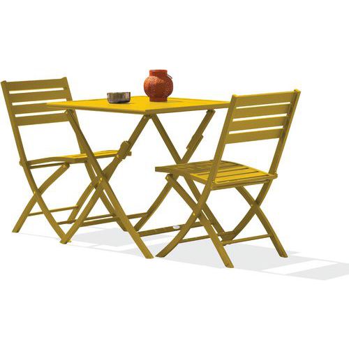 | Intitulé du produit | Table jardin 70x70cm moutarde + 2 chaises pliantes, Livré monté: non, Plateau longueur: 700 mm |