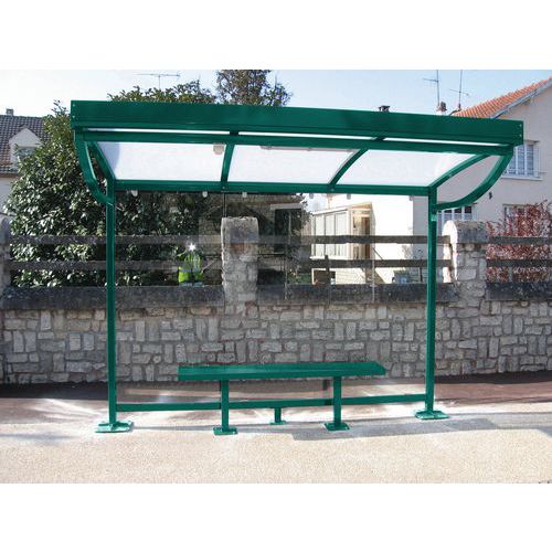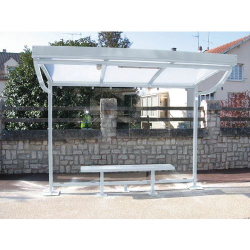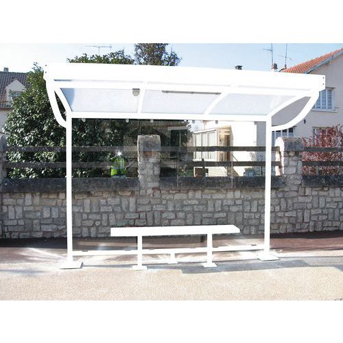 Construction ossature en tube acier galvanisé. Poteaux et traverses 80 x 60 x 5 mm. Arceaux de toiture 60 x 30 x 3 mm. Tôles bandeaux : tôle galvanisée épaisseur 2 mm. Pieds réglables sur platine 200 x 200 x 5 mm. Visserie d’assemblage en acier inoxydable classe A2. Couverture polycarbonate alvéolaire traité anti-UV, d’une épaisseur de 10 mm. Finition peinture polyester thermodurcissable cuite à 200°C, insensible aux UV. Habillage verre trempé «sécurit» clair épaisseur 8 mm. Fixation par vis d’ancrage M12/65 sur dalle béton ou plots béton ou sur un enrobé propre et plan. L'enrobé doit avoir une épaisseur minimum de 7 cm. Autres RAL disponibles sur demande, pour personnalisation