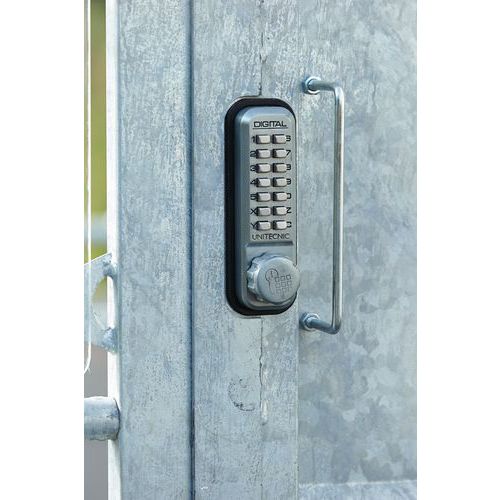 Abri avec porte en tôle à fermeture digicode mécanique.
