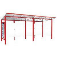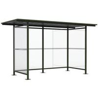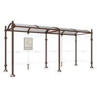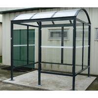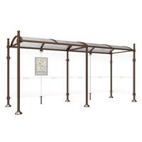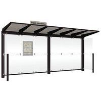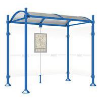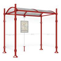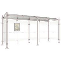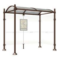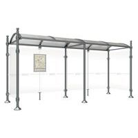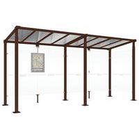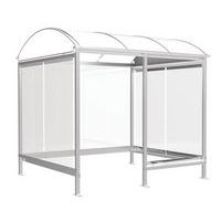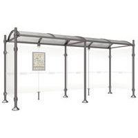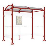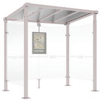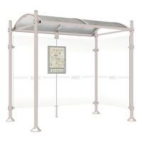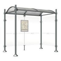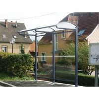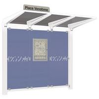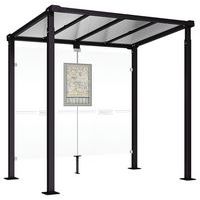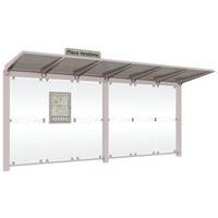 Abri bus Province avec poteaux ronds Ø 76 mm, sur platines, pommeau inox brossé. Tubes aluminium épaisseur 3 mm. Toiture : voûte en polycarbonate alvéolaire 6 mm traité anti-UV, cadre avec 2 traverses en tube aluminium 40 x 60 mm et 2 gouttières en profilé aluminium. Bardage de fond et latéral en verre sécurisé 8 mm. Vitrine horaire 750 x 550 mm (4 A4), épaisseur 30 mm en aluminium anodisé Arceaux en profilé aluminium cintré. Embases et colliers en aluminium moulé. Vitrine horaire : porte battante remplaçable et réversible. Vitrage plexichocs, ép. 4 mm. Serrure de sécurité 2 clés. Joint d’étanchéité élastomère. Fond tôle galvanisée, laqué blanc. Pose sur platines. Fixation fournie