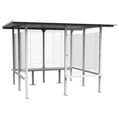 Abri fumeurs Beaufortain avec Pieds réglables en hauteur (1,95 m au plus bas) Finition : peinture polyester thermodurcissable cuite à 200°C, insensible aux UV Habillage : Verre trempé «sécurit» clair, épaisseur 4 mm Matériaux de qualité : Poteaux et traverses en tube acier 50 x50 mm galvanisé à chaud Visserie anticorrosion Couverture : Bac acier galvanisé couverture sèche «Haironville» cadré 4 côtés par cornières aluminium. Joint poli industriel. Fixation par patte à glace aluminium. Fixation non fournie : Utiliser vis d’ancrage M12/65 sur dalle béton ou des plots béton. Utiliser tiges filetées M12/120 sur enrobé propre et plan. L'enrobé doit avoir une épaisseur minimum de 7 cm. Autres RAL disponibles sur demande, pour personnalisation