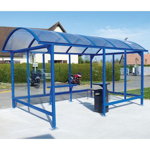 Abri fumeurs avec ossature en tube acier galvanisé et pliée.