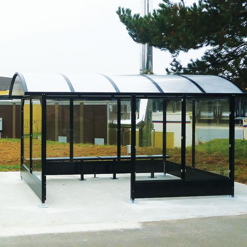 Abri fumeurs avec ossature en tube acier galvanisé et pliée.
