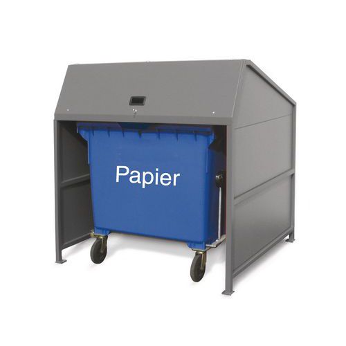 Abri avec toit et trois cloisons, muni d’un clapet verrouillable avec serrure à cylindre.