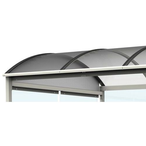 Grande modularité. Pieds réglables en hauteur. Visserie anticorrosion. Construction ossature en tube acier galvanisé. Poteaux de 60 x 60 mm. Traverses et rives acier plié. Lisse de protection tube acier diamètre 40 mm en fond d’abri. Couverture polycarbonate alvéolaire traité UV 2 faces, pincé entre arceaux profil aluminium. Finition peinture polyester thermodurcissable cuite à 200°C, insensible aux UV. Habillage verre trempé «sécurit» clair, épaisseur 8 mm. Joint poli industriel. Fixation par vis poêlier, canon nylauto. Fixation non fournie : Utiliser vis d’ancrage M12/65 sur dalle béton ou plots béton. Utiliser tiges filetées M12/120 sur enrobé propre et plan. L'enrobé doit avoir une épaisseur minimum de 7 cm. Autres RAL disponibles sur demande, pour personnalisation. Garantie client : 10 ans