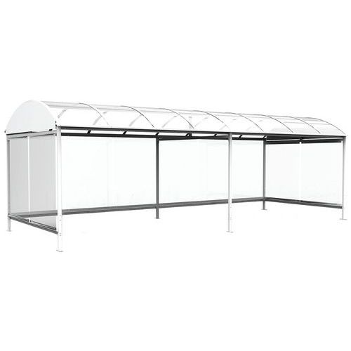Grande modularité. Pieds réglables en hauteur. Visserie anticorrosion. Construction ossature en tube acier galvanisé. Poteaux de 60 x 60 mm. Traverses et rives acier plié. Lisse de protection tube acier diamètre 40 mm en fond d’abri. Couverture polycarbonate alvéolaire traité UV 2 faces, pincé entre arceaux profil aluminium. Finition peinture polyester thermodurcissable cuite à 200°C, insensible aux UV. Habillage verre trempé «sécurit» clair, épaisseur 8 mm. Joint poli industriel. Fixation par vis poêlier, canon nylauto. Fixation non fournie : Utiliser vis d’ancrage M12/65 sur dalle béton ou plots béton. Utiliser tiges filetées M12/120 sur enrobé propre et plan. L'enrobé doit avoir une épaisseur minimum de 7 cm. Autres RAL disponibles sur demande, pour personnalisation.