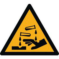 Adhésif de marquage au sol danger W023-Substances corrosives. Profil mince pour limiter les impacts latéraux, offrant une solution de marquage au sol durable. Adhésif de bord à bord, assure la meilleure adhérence possible aux sols et réduit les risques de plis et de décollement de la bande. Conforme à la norme ISO 7010.