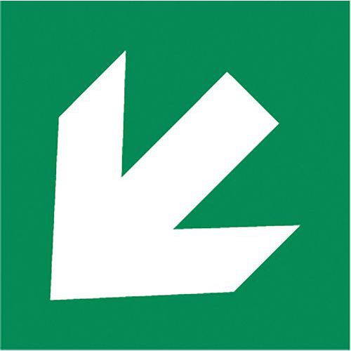 Adhésif marquage au sol E005 - Flèche de direction angle 45°. Profil mince pour limiter les impacts latéraux, offrant une solution de marquage au sol durable. Adhésif de bord à bord, assure la meilleure adhérence possible aux sols et réduit les risques de plis et de décollement de la bande. Conforme à la norme ISO 7010.