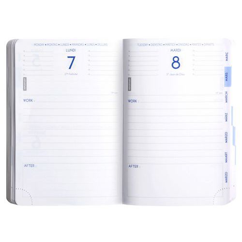 Son agencement, avec un jour par page la semaine et deux jours par page pour le week-end, permet de rester organisé tout en allant à l'essentiel.