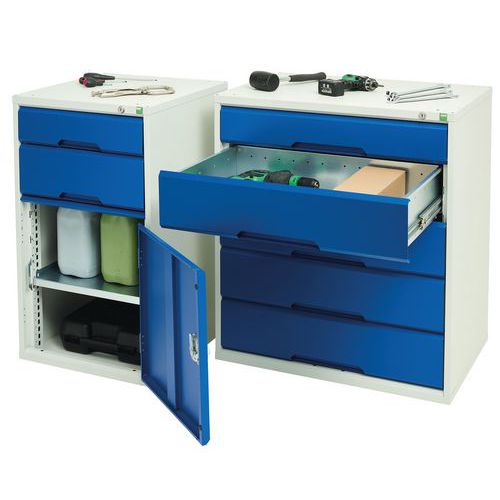 Caisson en tôle d’acier soudé avec renforts pour une utilisation en milieu industriel. Tiroirs montés sur glissières à roulements supportant une charge de 60 Kg. Ouverture et fermeture aisées, même à pleine charge. Fermeture des tiroirs par verrouillage centralisé. Profondeur unique de 550 mm. Conseils de sécurité : - installer le meuble sur une surface plane - le fixer sur un mur ou une cloison avec une fixation adaptée - veiller à ne pas dépasser la charge maximum conseillée, ainsi qu’à sa bonne répartition