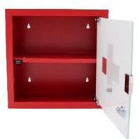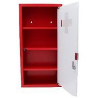 - Armoire a pharmacie en métal laqué rouge avec une porte en verre trempée blanche.