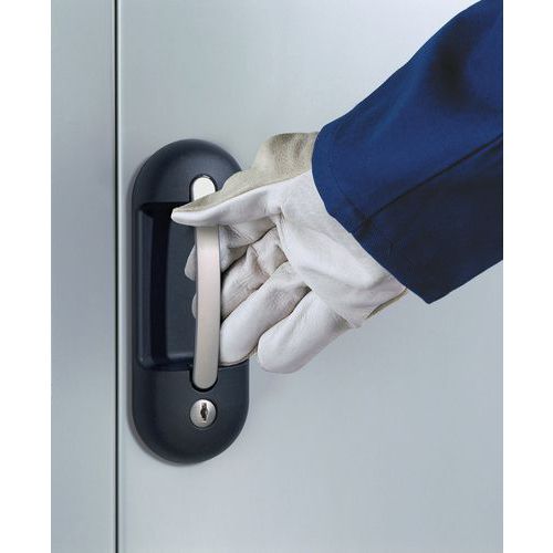 Armoire à portes battantes en acier. Suspension de porte sur des charnières extérieures, avec un angle d'ouverture d'environ 180°. Renforcement de la porte pour une stabilité accrue et barre de fermeture masquée. Différentes variantes de dimensions (3 longueurs, 1 hauteur). Haute flexibilité de l´aménagement intérieur grâce à un ajustement possible tous les 15 mm. Une sécurité d´utilisation, une résistance à l´usure et un aspect encore améliorés grâce à la serrure à poignée moulée Ergo-Lock (fermeture à 3 points, serrure à cylindre, livrée avec 2 clés). Capacité de charge par tablette zinguée : 110 kg. Capacité de charge totale de l'armoire : 700 kg. Coloris structure : gris RAL 7035. Coloris portes au choix : bleu RAL 5010, vert RAL 6011 ou gris RAL 7035.