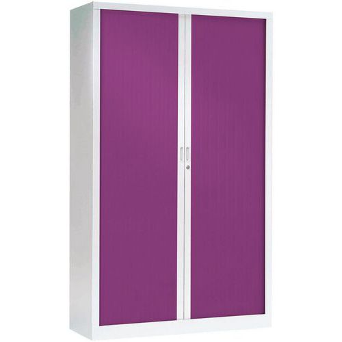 Armoire à rideaux monobloc. Etagères réglables équipées pour recevoir des dossiers suspendus. Fond plat et 4 vérins de réglages. Serrure avec 2 clés à embouts pliants. Rideaux à ouverture totale et poignées encastrées. Egayer vos espaces de travail avec ces armoires aux rideaux de couleur fun