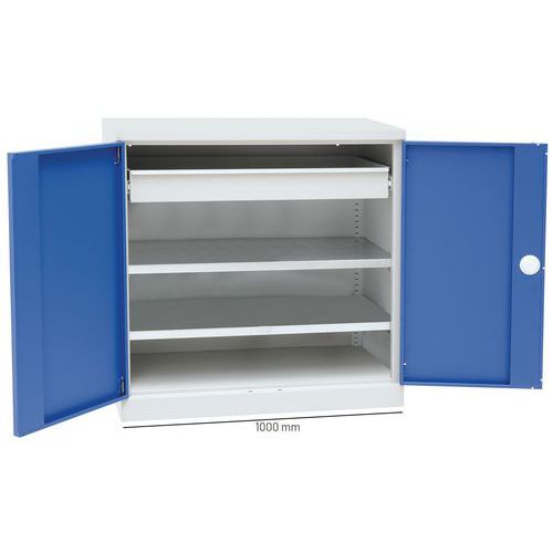 | Intitulé du produit | Armoire basse à tablettes et tiroirs coulissants, Charge maxi: 120 kg, Matériau: Acier |
