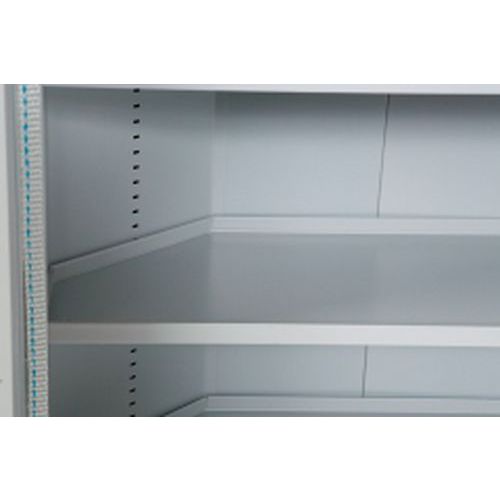 Toutes les étagères ont des rebords pour éviter les déversements. Le volume de collecte par étagère et le fond de l’armoire est de 7 litres chacun pour les références 46610/46611 et de 9 litres chacun pour la référence 59307.