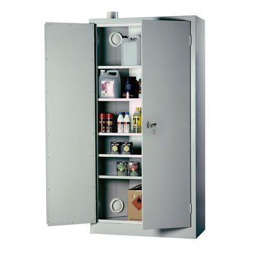 Armoire chimique ignifuge, en tôle d’acier thermolaquée.La porte, l’extrémité, l’arrière, le toit et le fond sont en « structure sandwich », avec isolation intermédiaire.