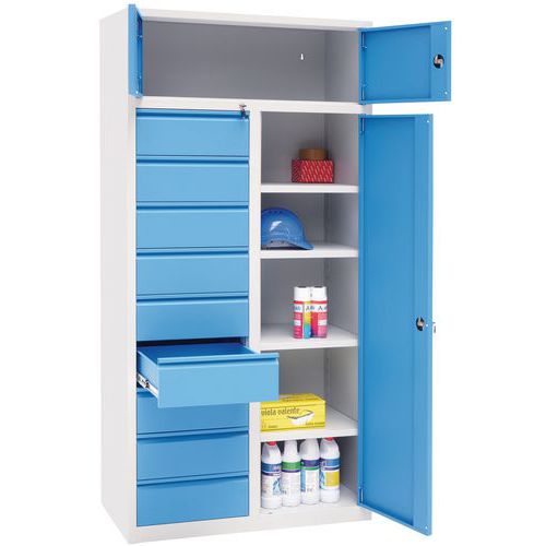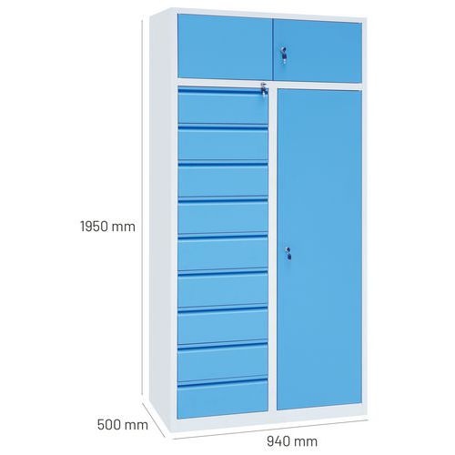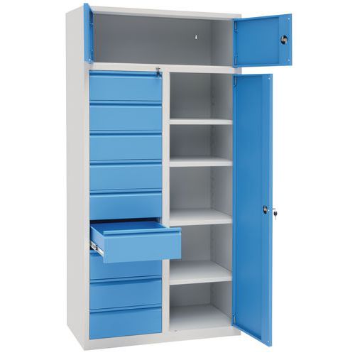 | Intitulé du produit | Armoire combinée Manutan, Charge maxi: 500 kg, Matériau: Acier, Hauteur hors tout: 1950 mm, Nb de tiroirs: 9 |