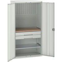 Rangez vos outils de manière ordonnée dans cette armoire d’atelier à tiroirs. Fond constitué de panneaux perforés et de panneaux avec habillage à bacs. Ajustez simplement la tablette en hauteur. Verrouillez les portes de manière sécurisée grâce au dispositif de fermeture à trois points et à la serrure à cylindre. Avec tiroirs à roulements à billes pour une ouverture et une fermeture tout en souplesse. Conseils de sécurité : - installer le meuble sur une surface plane - le fixer sur un mur ou une cloison avec une fixation adaptée - veiller à ne pas dépasser la charge maximum conseillée, ainsi qu’à sa bonne répartition