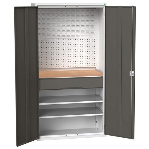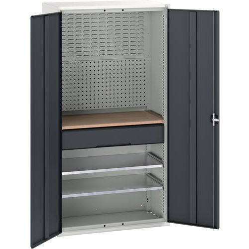 Rangez vos outils de manière ordonnée dans cette armoire d’atelier à tiroirs. Fond constitué de panneaux perforés et de panneaux avec habillage à bacs. Ajustez simplement la tablette en hauteur. Verrouillez les portes de manière sécurisée grâce au dispositif de fermeture à trois points et à la serrure à cylindre. Avec tiroirs à roulements à billes pour une ouverture et une fermeture tout en souplesse. Conseils de sécurité : - installer le meuble sur une surface plane - le fixer sur un mur ou une cloison avec une fixation adaptée - veiller à ne pas dépasser la charge maximum conseillée, ainsi qu’à sa bonne répartition