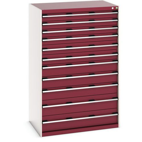 Armoire à tiroirs très robuste et de haute qualité. Tiroirs extractibles et pleinement accessibles. Glissières avec fermeture automatique et blocage de sécurité empêchant l'ouverture intempestive. Les poignées des tiroirs peuvent accueillir une étiquette. Avec verrouillage central des tiroirs. Conseils de sécurité : - installer le meuble sur une surface plane - le fixer sur un mur ou une cloison avec une fixation adaptée - veiller à ne pas dépasser la charge maximum conseillée, ainsi qu’à sa bonne répartition Fabriqué au RU Charge maxi (kg) : 1500