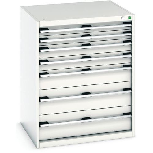 Armoire à tiroirs très robuste et de haute qualité. Tiroirs extractibles et pleinement accessibles. Glissières avec fermeture automatique et blocage de sécurité empêchant l'ouverture intempestive. Les poignées des tiroirs peuvent accueillir une étiquette. Avec verrouillage central des tiroirs. Conseils de sécurité : - installer le meuble sur une surface plane - le fixer sur un mur ou une cloison avec une fixation adaptée - veiller à ne pas dépasser la charge maximum conseillée, ainsi qu’à sa bonne répartition Fabriqué au RU Charge maxi (kg) : 1500