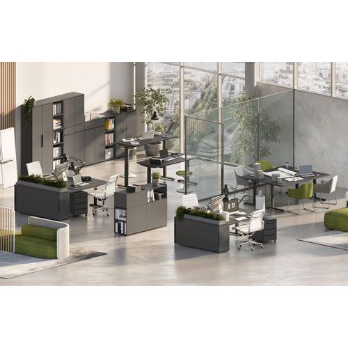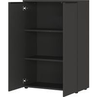 - Armoire bureau avec 2 portes, derrière 2 étagères réglables (chacune pouvant supporter une charge de 10 kg), ce qui donne 3 hauteurs de classeurs.