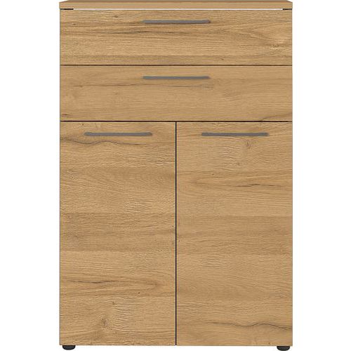 - Armoire bureau avec deux tiroirs (chacun chargeable jusqu'à 10 kg) et deux portes, derrière une tablette réglable (chargeable jusqu'à 10 kg).
