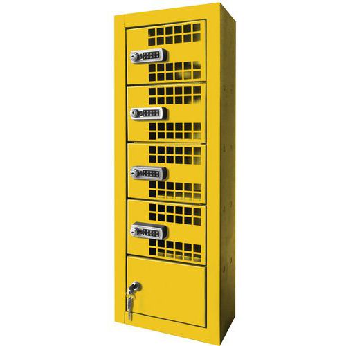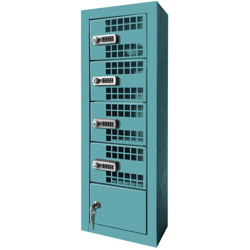 Armoire de rechargement électrifiée pour Smartphone. Robuste avec corps et porte ajourée en tôle électrozinguée. Alimentation électrique 230 V classique et consommation 40 W. Fermeture par serrure électronique code 4 chiffres mode consigne. Fixation murale possible avec 4 orifices préalablement percés. Armoire de belle finition, peinture époxy, 8 coloris au choix. Pratique avec étiquette mode d’emploi sur chaque porte.