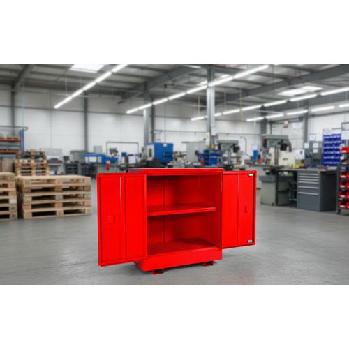 Armoire sécurisée pour conserver les produits dangereux en sécurité, rangés et accessibles. Serrures clé unique 5 leviers pêne dormant. Système unique anti-effraction interne. Construction robuste en acier 1,6mm et 2mm. Ventilation niveaux haut et bas pour prévenir l’accumulation de fumées. Gaze anti-feu installée. Complète avec 2 étagères totalement ajustables