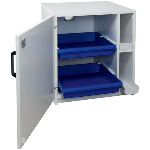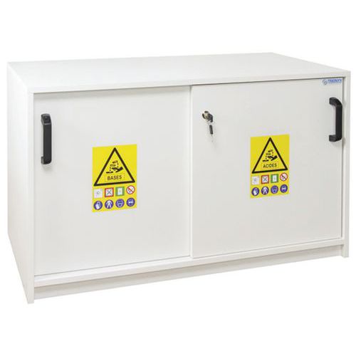 Armoire de sécurité compartimentée permettant la séparation des acides et des bases. Équipée de pieds vérins pour mise à niveau. Bacs de rétention en polypropylène sur rails coulissants. Construction résistance aux agressions des vapeurs corrosives. Orifices de ventilation pour raccordement à une ventilation. Conforme aux recommandations de l'INRS. Fabriqué en France