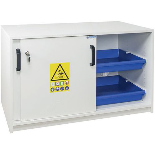 Armoire de sécurité compartimentée permettant la séparation des acides et des bases. Équipée de pieds vérins pour mise à niveau. Bacs de rétention en polypropylène sur rails coulissants. Construction résistance aux agressions des vapeurs corrosives. Orifices de ventilation pour raccordement à une ventilation. Conforme aux recommandations de l'INRS.