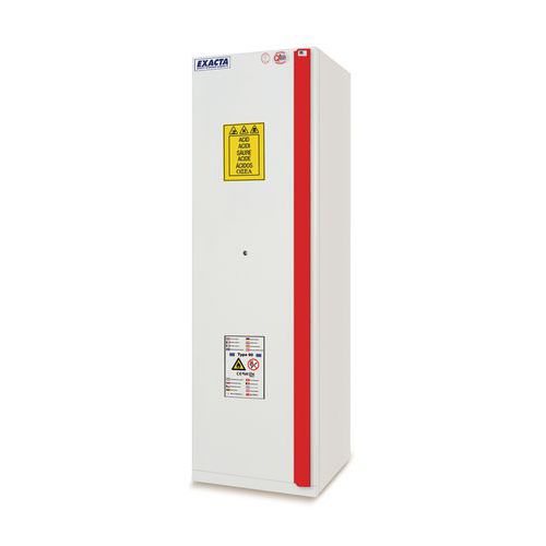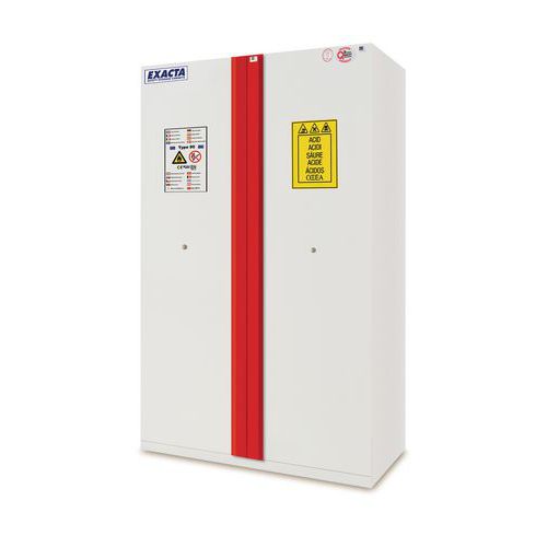 Armoire de sécurité avec fermeture de portes à clé. Équipée pour la mise en terre avec vérin de mise à niveau. Étagères en acier testées au feu et ajustables en hauteur. Fermeture automatique des portes lorsque la température ambiante dépasse les 50°C. Armoire 1 porte/2 compartiments comprenant : - 1 compartiment inflammable avec 1 étagère en acier peint + 1 bac de rétention avec caillebotis - 1 compartiment acides/bases avec 3 étagères en acier peint. Armoire 1 porte/3 compartiments comprenant : - 1 compartiment inflammable avec 1 étagère en acier peint + 1 bac de rétention avec caillebotis - 1 compartiment acides avec 2 étagères en acier peint - 1 compartiment bases avec 1 étagère en acier inox. Armoire 2 portes/2 compartiments comprenant : - 1 compartiment inflammable avec 3 étagères en acier peint + 1 bac de rétention avec caillebotis - 1 compartiment acides/bases avec 3 étagères en acier peint. Armoire 2 portes/3 compartiments comprenant : - 1 compartiment inflammable avec 3 étagères en acier peint + 1 bac de rétention avec caillebotis - 1 compartiment acides avec 2 étagères en acier peint - 1 compartiment bases avec 2 étagères en acier inox. Armoire 2 portes/4 compartiments comprenant : - 1 compartiment inflammable avec 3 étagè