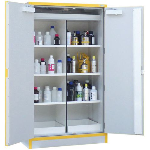Armoire de sécurité multirisques conforme à la norme EN 14470-1. Possède une résistance au feu 30 min. Avec compartiments permettant de séparer les produits chimiques incompatibles. Fermeture à clef en 3 points avec serrure anti-étincelles. Orifices de ventilation pour raccordement à une ventilation. Joints de porte thermodilatants Pieds vérins pour mise à niveau Conduits de ventilation avec système thermofusible. Testée et homologuée à la norme FM 6050.