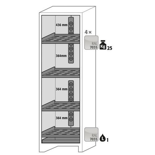 3 x étagères perforées, capacité de charge : 75 kg, tôle d'acier revêtue par poudre, gris clair RAL 7035 1 x multiprise (3 unités au total, version UE) 1 x bac de récupération inférieur, capacité : 3 litres, tôle d'acier revêtue par poudre, gris clair RAL 7035.