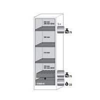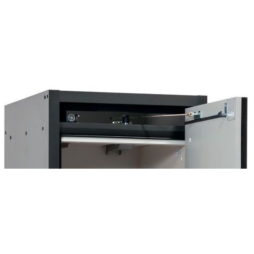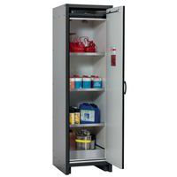 Stockage sécurisé, conforme à la réglementation en vigueur des produits dangereux, inflammables dans les zones de travail Fonction / Construction : Robuste et durable : structure extérieure solide en plaques ignifugées revêtues d'une résine de mélamine, 3 charnières de fixation de porte, mécanisme de fermeture complet et éléments de sécurité protégés contre la corrosion montés hors de la zone de stockage, porte de qualité, résistante aux rayures avec surface structurée revêtue époxy Ergonomique : la porte restent à la position lors de l´ouverture, fermeture automatique en cas d'incendie Utilisation controlée : porte verrouillable, compatible avec fermeture centralisée Transport facile : socle de transport intégré, en option plinthe de finition simple ou plinthe complétée de 4 pieds de mise à niveau Aération et ventilation : système d'aération et de ventilation intégrés pour le raccordement (diamètre 75 mm) à un dispositif technique d'évacuation d'air