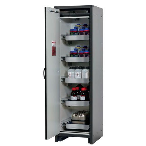 Stockage sécurisé, conforme à la réglementation en vigueur des produits dangereux, inflammables dans les zones de travail Fonction / Construction : Robuste et durable : structure extérieure solide en plaques ignifugées revêtues d'une résine de mélamine, 3 charnières de fixation de porte, mécanisme de fermeture complet et éléments de sécurité protégés contre la corrosion montés hors de la zone de stockage, porte de qualité, résistante aux rayures avec surface structurée revêtue époxy Ergonomique : la porte restent à la position lors de l´ouverture, fermeture automatique en cas d'incendie Utilisation controlée : porte verrouillable, compatible avec fermeture centralisée Transport facile : socle de transport intégré, en option plinthe de finition simple ou plinthe complétée de 4 pieds de mise à niveau Aération et ventilation : système d'aération et de ventilation intégrés pour le raccordement (diamètre 75 mm) à un dispositif technique d'évacuation d'air