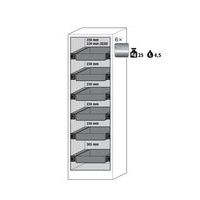 Stockage sécurisé, conforme à la réglementation en vigueur des produits dangereux, inflammables dans les zones de travail Fonction / Construction : Robuste et durable : structure extérieure solide en plaques ignifugées revêtues d'une résine de mélamine, 3 charnières de fixation de porte, mécanisme de fermeture complet et éléments de sécurité protégés contre la corrosion montés hors de la zone de stockage, porte de qualité, résistante aux rayures avec surface structurée revêtue époxy Ergonomique : la porte restent à la position lors de l´ouverture, fermeture automatique en cas d'incendie Utilisation controlée : porte verrouillable, compatible avec fermeture centralisée Transport facile : socle de transport intégré, en option plinthe de finition simple ou plinthe complétée de 4 pieds de mise à niveau Aération et ventilation : système d'aération et de ventilation intégrés pour le raccordement (diamètre 75 mm) à un dispositif technique d'évacuation d'air Fabriqué en Allemagne Charge maxi (kg) : 300