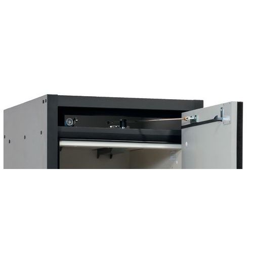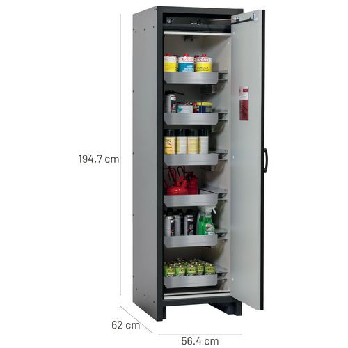 Stockage sécurisé, conforme à la réglementation en vigueur des produits dangereux, inflammables dans les zones de travail Fonction / Construction : Robuste et durable : structure extérieure solide en plaques ignifugées revêtues d'une résine de mélamine, 3 charnières de fixation de porte, mécanisme de fermeture complet et éléments de sécurité protégés contre la corrosion montés hors de la zone de stockage, porte de qualité, résistante aux rayures avec surface structurée revêtue époxy Ergonomique : la porte restent à la position lors de l´ouverture, fermeture automatique en cas d'incendie Utilisation controlée : porte verrouillable, compatible avec fermeture centralisée Transport facile : socle de transport intégré, en option plinthe de finition simple ou plinthe complétée de 4 pieds de mise à niveau Aération et ventilation : système d'aération et de ventilation intégrés pour le raccordement (diamètre 75 mm) à un dispositif technique d'évacuation d'air