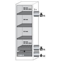 Stockage sécurisé, conforme à la réglementation en vigueur des produits dangereux, inflammables dans les zones de travail Fonction / Construction : Robuste et durable : structure extérieure solide en plaques ignifugées revêtues d'une résine de mélamine, 3 charnières de fixation de porte, mécanisme de fermeture complet et éléments de sécurité protégés contre la corrosion montés hors de la zone de stockage, porte de qualité, résistante aux rayures avec surface structurée revêtue époxy Ergonomique : la porte restent à la position lors de l´ouverture, fermeture automatique en cas d'incendie Utilisation controlée : porte verrouillable, compatible avec fermeture centralisée Transport facile : socle de transport intégré, en option plinthe de finition simple ou plinthe complétée de 4 pieds de mise à niveau Aération et ventilation : système d'aération et de ventilation intégrés pour le raccordement (diamètre 75 mm) à un dispositif technique d'évacuation d'air