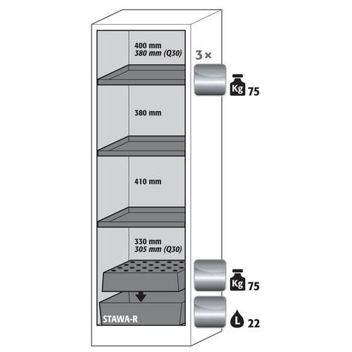 Stockage sécurisé, conforme à la réglementation en vigueur des produits dangereux, inflammables dans les zones de travail Fonction / Construction : Robuste et durable : structure extérieure solide en plaques ignifugées revêtues d'une résine de mélamine, 3 charnières de fixation de porte, mécanisme de fermeture complet et éléments de sécurité protégés contre la corrosion montés hors de la zone de stockage, porte de qualité, résistante aux rayures avec surface structurée revêtue époxy Ergonomique : la porte restent à la position lors de l´ouverture, fermeture automatique en cas d'incendie Utilisation controlée : porte verrouillable, compatible avec fermeture centralisée Transport facile : socle de transport intégré, en option plinthe de finition simple ou plinthe complétée de 4 pieds de mise à niveau Aération et ventilation : système d'aération et de ventilation intégrés pour le raccordement (diamètre 75 mm) à un dispositif technique d'évacuation d'air Charge maxi (kg) : 600 kg