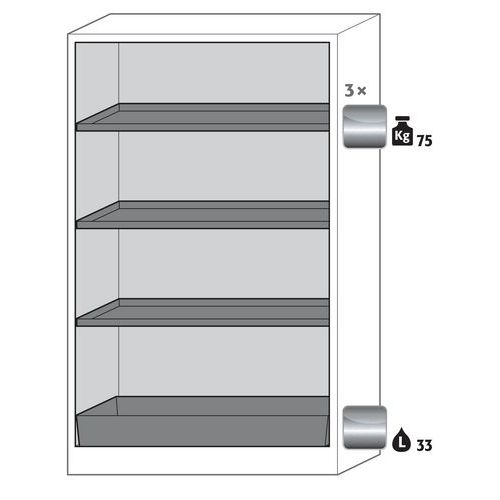 Stockage sécurisé, conforme à la réglementation en vigueur des produits dangereux, inflammables dans les zones de travail Fonction / Construction : Robuste et durable : structure extérieure solide en plaques ignifugées revêtues d'une résine de mélamine, 3 charnières de fixation de porte, mécanisme de fermeture complet et éléments de sécurité protégés contre la corrosion montés hors de la zone de stockage, porte de qualité, résistante aux rayures avec surface structurée revêtue époxy Ergonomique : maintien des portes en toute position, fermeture automatique en cas d'incendie Utilisation controlée : portes verrouillables avec un système de fermeture centralisée (passe) Transport facile : socle de transport intégré, en option plinthe de finition simple ou plinthe complétée de 4 pieds de mise à niveau Aération et ventilation : système d'aération et de ventilation intégrés pour le raccordement (diamètre 75 mm) à un dispositif technique d'évacuation d'air Fabriqué en Allemagne Charge maxi (kg) : 600 kg