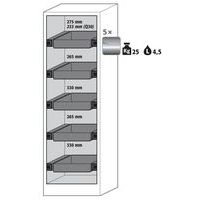 Stockage sécurisé, conforme à la réglementation en vigueur des produits dangereux, inflammables dans les zones de travail Fonction / Construction : Robuste et durable : structure extérieure solide en plaques ignifugées revêtues d'une résine de mélamine, 3 charnières de fixation de porte, mécanisme de fermeture complet et éléments de sécurité protégés contre la corrosion montés hors de la zone de stockage, porte de qualité, résistante aux rayures avec surface structurée revêtue époxy Ergonomique : la porte restent à la position lors de l´ouverture, fermeture automatique en cas d'incendie Utilisation controlée : porte verrouillable, compatible avec fermeture centralisée Transport facile : socle de transport intégré, en option plinthe de finition simple ou plinthe complétée de 4 pieds de mise à niveau Aération et ventilation : système d'aération et de ventilation intégrés pour le raccordement (diamètre 75 mm) à un dispositif technique d'évacuation d'air