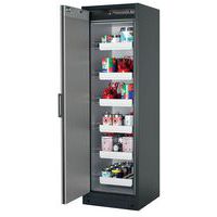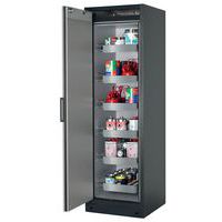 Stockage sécurisé, conforme à la réglementation en vigueur des produits dangereux, inflammables dans les zones de travail Fonction / Construction : Robuste et durable : structure extérieure acier, résistante aux rayures, peinture époxy, 3 charnières de fixation de porte, fermeture protégé contre la corrosion Ergonomique : la porte restent à la position lors de l´ouverture, fermeture automatique en cas d'incendie Utilisation controlée : porte verrouillable, compatible avec fermeture centralisée, indicateur de verrouillage des portes (rouge/vert) Transport facile : socle de transport intégré, plinthe disponible en option Installation facile : pieds réglables intégrés Aération et ventilation : système d'aération et de ventilation pour le raccordement à un système d´extraction ou de ventilation filtrée autonome, hélice sur la grille d'évacuation indiquant une ventilation