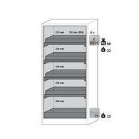 Stockage sécurisé, conforme à la réglementation en vigueur des produits dangereux, inflammables dans les zones de travail Fonction / Construction : Robuste et durable : structure extérieure acier, résistante aux rayures, peinture époxy, 3 charnières de fixation de porte, fermeture protégé contre la corrosion Ergonomique : maintien des portes en toute position, fermeture automatique en cas d'incendie Utilisation controlée : portes verrouillables, compatible avec fermeture centralisée, indicateur de verrouillage des portes (rouge/vert) Transport facile : socle de transport intégré, plinthe disponible en option Installation facile : pieds réglables intégrés Aération et ventilation : système d'aération et de ventilation pour le raccordement à un système d´extraction ou de ventilation filtrée autonome, hélice sur la grille d'évacuation indiquant une ventilation Fabriqué en Allemagne Charge maxi (kg) : 600 kg