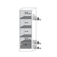 Stockage sécurisé, conforme à la réglementation en vigueur des produits dangereux, inflammables dans les zones de travail Fonction / Construction : Robuste et durable : structure extérieure acier, résistante aux rayures, peinture époxy, 3 charnières de fixation de porte, fermeture protégé contre la corrosion Ergonomique : la porte restent à la position lors de l´ouverture, fermeture automatique en cas d'incendie Utilisation controlée : porte verrouillable, compatible avec fermeture centralisée, indicateur de verrouillage des portes (rouge/vert) Transport facile : socle de transport intégré, plinthe disponible en option Installation facile : pieds réglables intégrés Aération et ventilation : système d'aération et de ventilation pour le raccordement à un système d´extraction ou de ventilation filtrée autonome, hélice sur la grille d'évacuation indiquant une ventilation Fabriqué en Allemagne Charge maxi (kg) : 600 kg