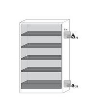 Stockage sécurisé, conforme à la réglementation en vigueur des produits dangereux, inflammables dans les zones de travail Fonction / Construction : Robuste et durable : structure extérieure acier, résistante aux rayures, peinture époxy, 3 charnières de fixation de porte, fermeture protégé contre la corrosion Tout en un : plusieurs compartiments permettent le stockage de différentes substances dangereuses dans une même armoire Ergonomique : maintien des portes en toute position, fermeture automatique en cas d'incendie Utilisation controlée : portes verrouillables, compatible avec fermeture centralisée, indicateur de verrouillage des portes (rouge/vert) Transport facile : socle de transport intégré, plinthe disponible en option Installation facile : pieds réglables intégrés Aération et ventilation : système d'aération et de ventilation pour le raccordement à un système d´extraction ou de ventilation filtrée autonome, hélice sur la grille d'évacuation indiquant une ventilation Fabriqué en Allemagne Charge maxi (kg) : 600 kg