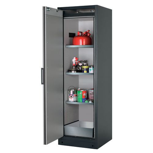 Stockage sécurisé, conforme à la réglementation en vigueur des produits dangereux, inflammables dans les zones de travail Fonction / Construction : Robuste et durable : structure extérieure acier, résistante aux rayures, peinture époxy, 3 charnières de fixation de porte, fermeture protégé contre la corrosion Confortable : rappel automatique de porte, maintien de porte en position ouverte, stockage sécurisé des récipients Toujours fermée : le dispositif automatique de fermeture des portes de série (TSA) libère la porte bloquée au bout de 60 secondes, alarmes visuelle et sonore avant la fermeture de la porte Utilisation controlée : porte verrouillable, compatible avec fermeture centralisée, indicateur de verrouillage des portes (rouge/vert) Transport facile : socle de transport intégré, plinthe disponible en option Installation facile : pieds réglables intégrés Aération et ventilation : système d'aération et de ventilation pour le raccordement à un système d´extraction ou de ventilation filtrée autonome, hélice sur la grille d'évacuation indiquant une ventilation