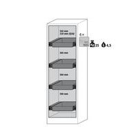 Stockage sécurisé, conforme à la réglementation en vigueur des produits dangereux, inflammables dans les zones de travail Fonction / Construction : Robuste et durable : structure extérieure acier, résistante aux rayures, peinture époxy, 3 charnières de fixation de porte, fermeture protégé contre la corrosion Confortable : rappel automatique de porte, maintien de porte en position ouverte, stockage sécurisé des récipients Toujours fermée : le dispositif automatique de fermeture des portes de série (TSA) libère la porte bloquée au bout de 60 secondes, alarmes visuelle et sonore avant la fermeture de la porte Utilisation controlée : porte verrouillable, compatible avec fermeture centralisée, indicateur de verrouillage des portes (rouge/vert) Transport facile : socle de transport intégré, plinthe disponible en option Installation facile : pieds réglables intégrés Aération et ventilation : système d'aération et de ventilation pour le raccordement à un système d´extraction ou de ventilation filtrée autonome, hélice sur la grille d'évacuation indiquant une ventilation Fabriqué en Allemagne Charge maxi (kg) : 600 kg