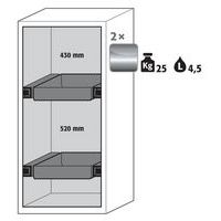 Stockage sécurisé, conforme à la réglementation en vigueur des produits dangereux, inflammables dans les zones de travail Fonction / Construction : Robuste et durable : structure extérieure solide en acier revêtu époxy, 3 charnières de fixation par porte, mécanisme de fermeture complet et éléments de sécurité protégés contre la corrosion montés hors de la zone de stockage Confortable : rappel automatique de porte, maintien de porte en position ouverte, stockage sécurisé des récipients Toujours fermée : le dispositif automatique de fermeture des portes de série (TSA) libère la porte bloquée au bout de 60 secondes, alarmes visuelle et sonore avant la fermeture de la porte Utilisation controlée : porte verrouillable, compatible avec fermeture centralisée Installation facile : pieds réglables intégrés Aération et ventilation : système d'aération et de ventilation intégrés pour le raccordement (diamètre 75 mm) à un dispositif technique d'évacuation d'air Fabriqué en Allemagne Charge maxi (kg) : 600 kg