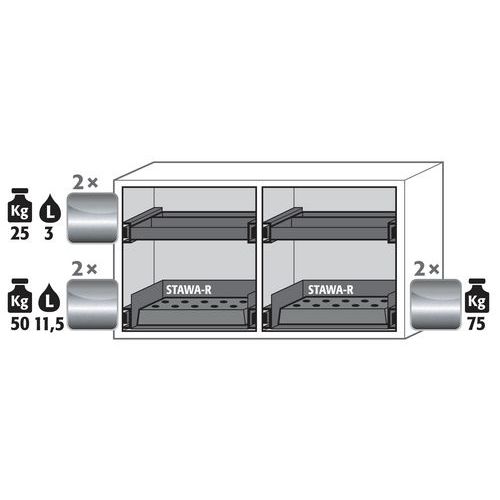 Stockage sécurisé, conforme à la réglementation en vigueur des produits dangereux, inflammables dans les zones de travail Fonction / construction: Robuste et durable: structure extérieure en acier revêtu époxy Confort de travail: immobilisation des tiroirs dans toutes les positions, accès vertical à tous les récipients, fermeture automatique en cas d'incendie Sûr: tiroirs avec câble de mise à la terre, borne, bac étanche soudé Utilisation controlée: tiroirs verrouillables avec serrure intégrée et indicateur de verrouillage des portes (rouge/vert) Mobile: socle avec roulettes en option, pour un déplacement facile de l'armoire Aération et ventilation: système d'aération et de ventilation intégré pour le raccordement (diamètre 50 mm) à un dispositif technique d'évacuation d'air Fabriqué en Allemagne Charge maxi (kg) : 600 kg